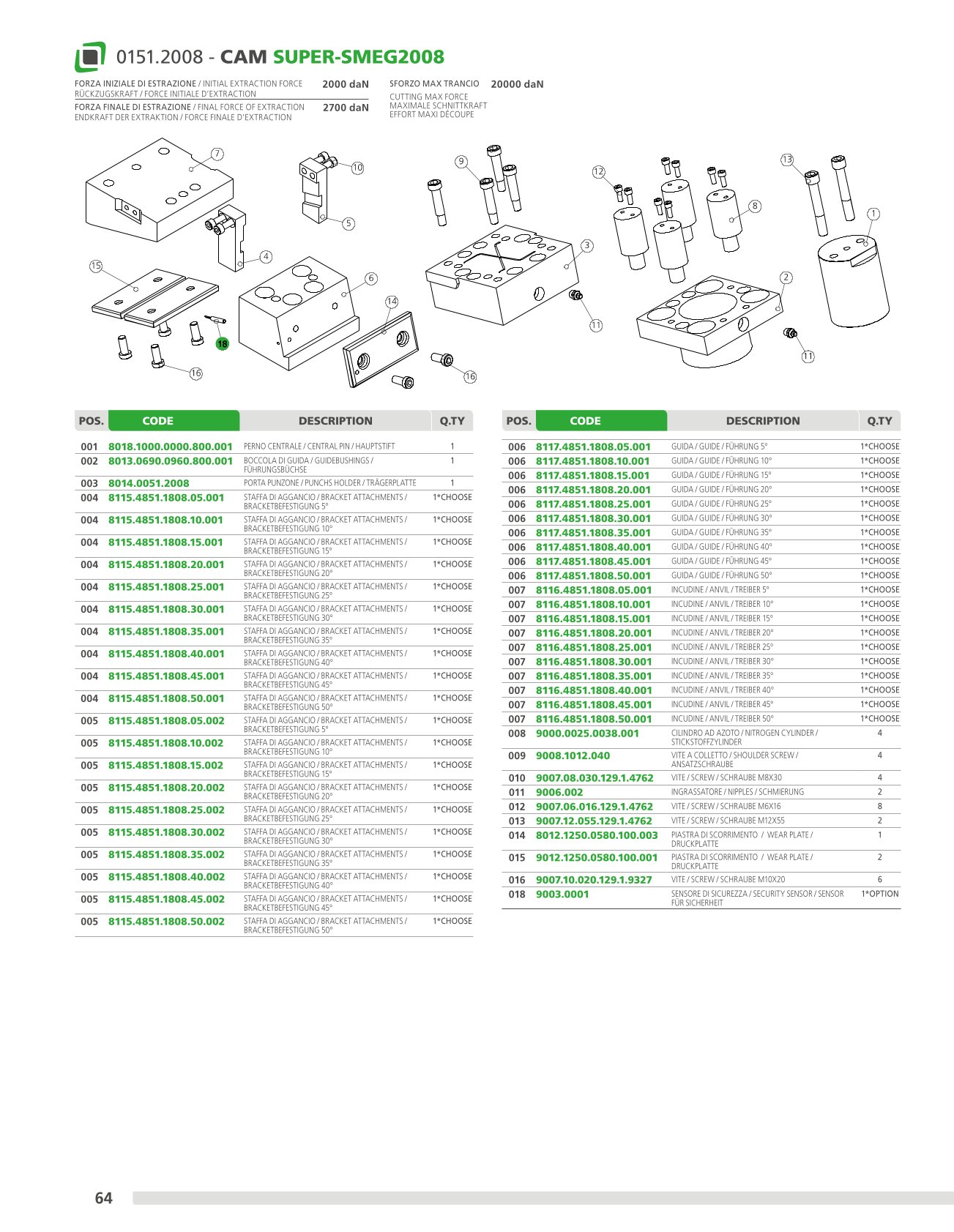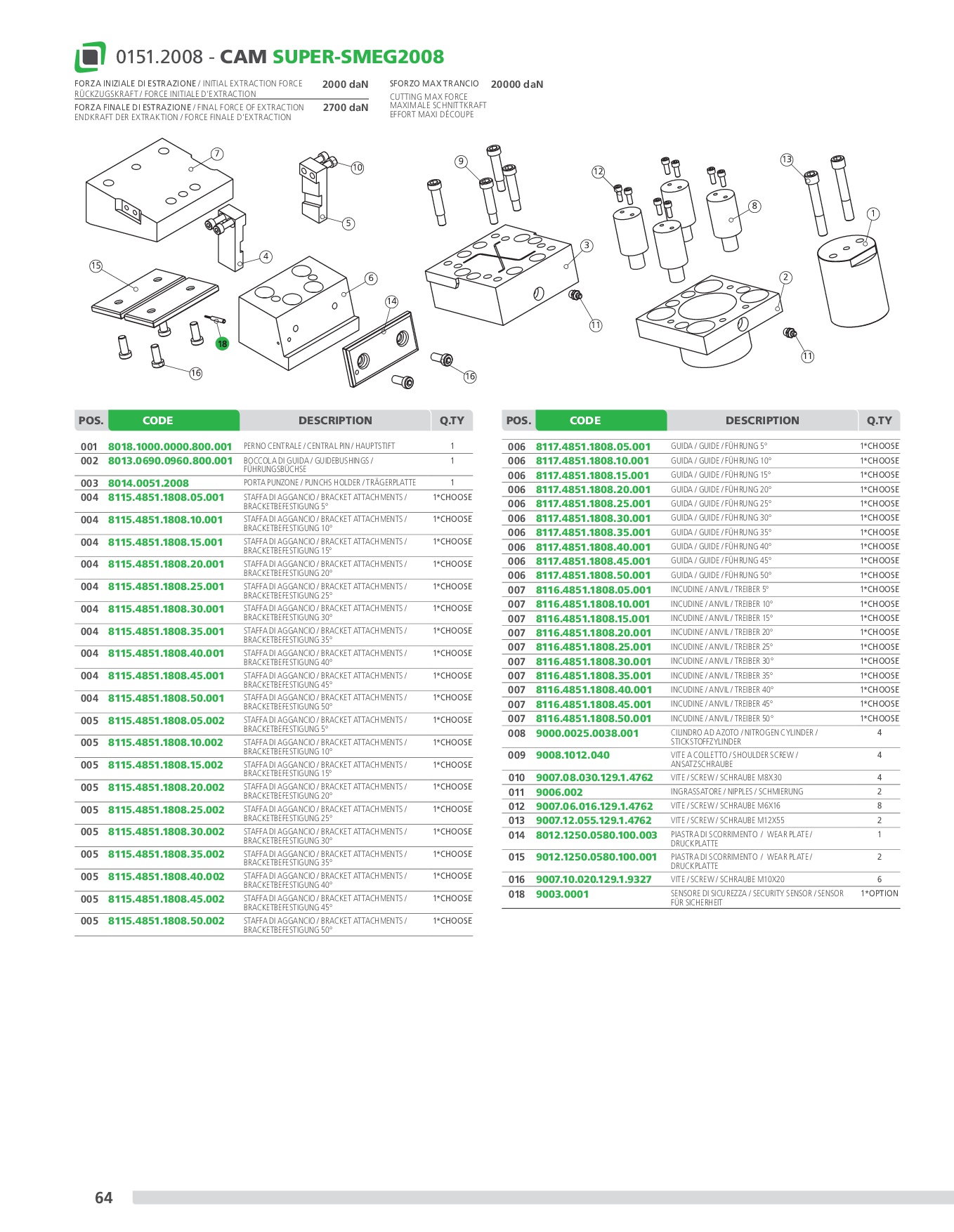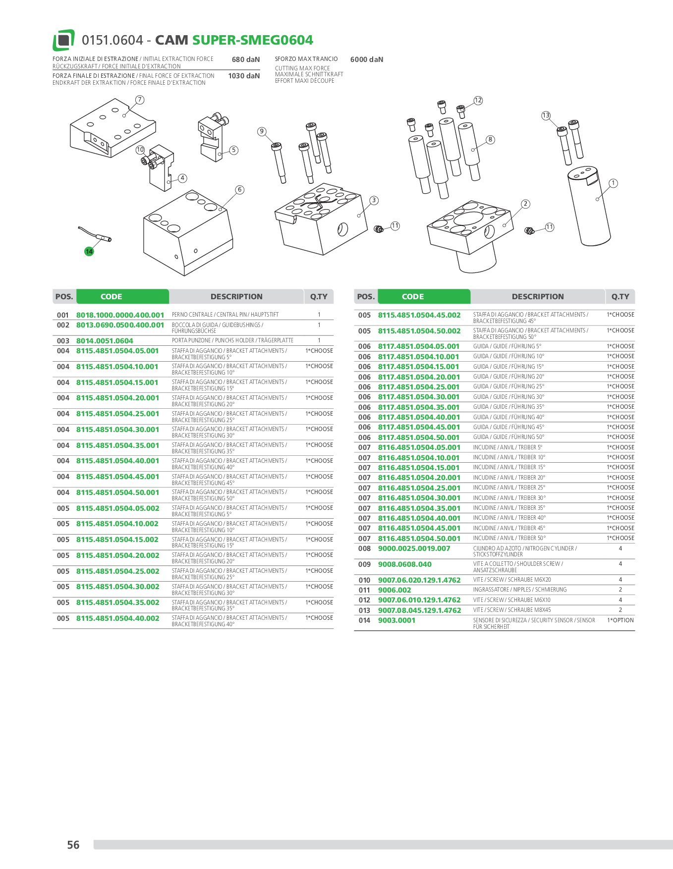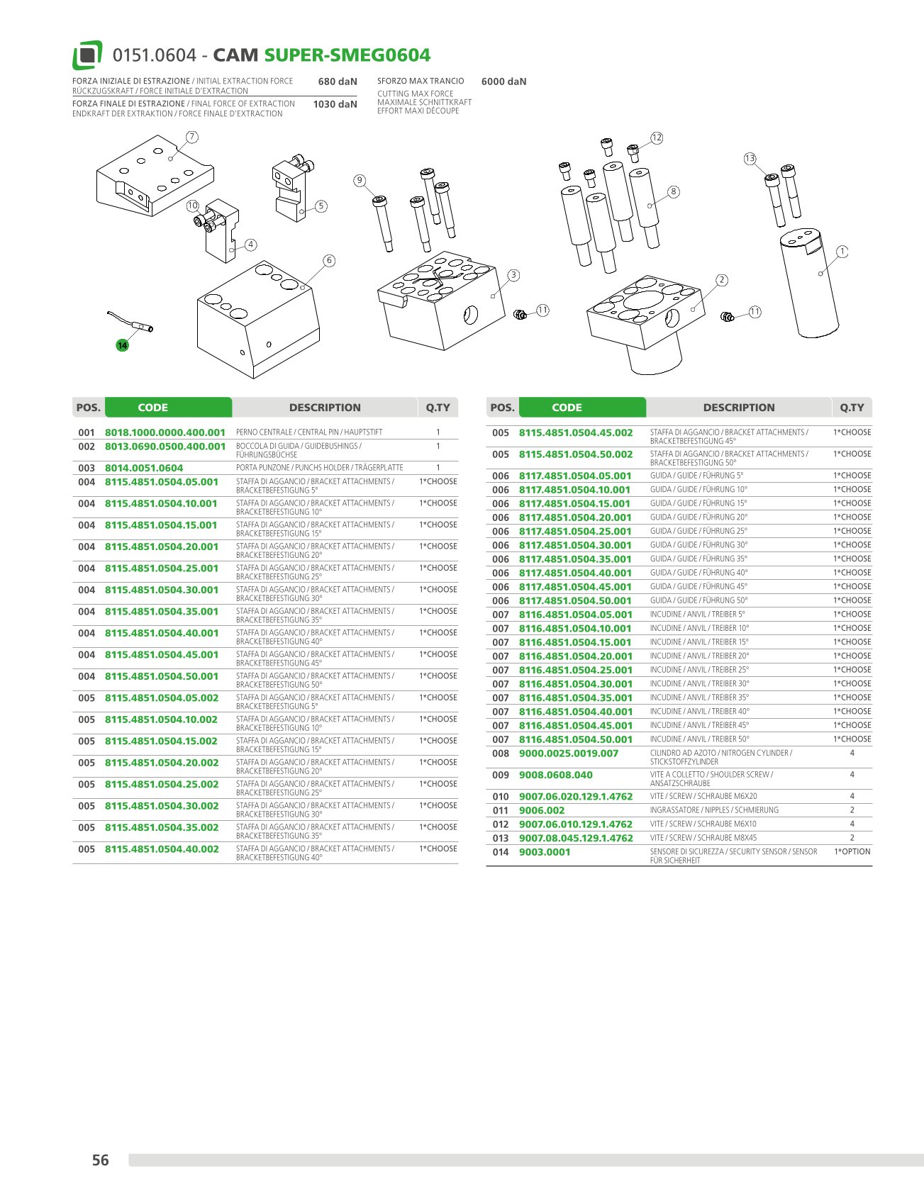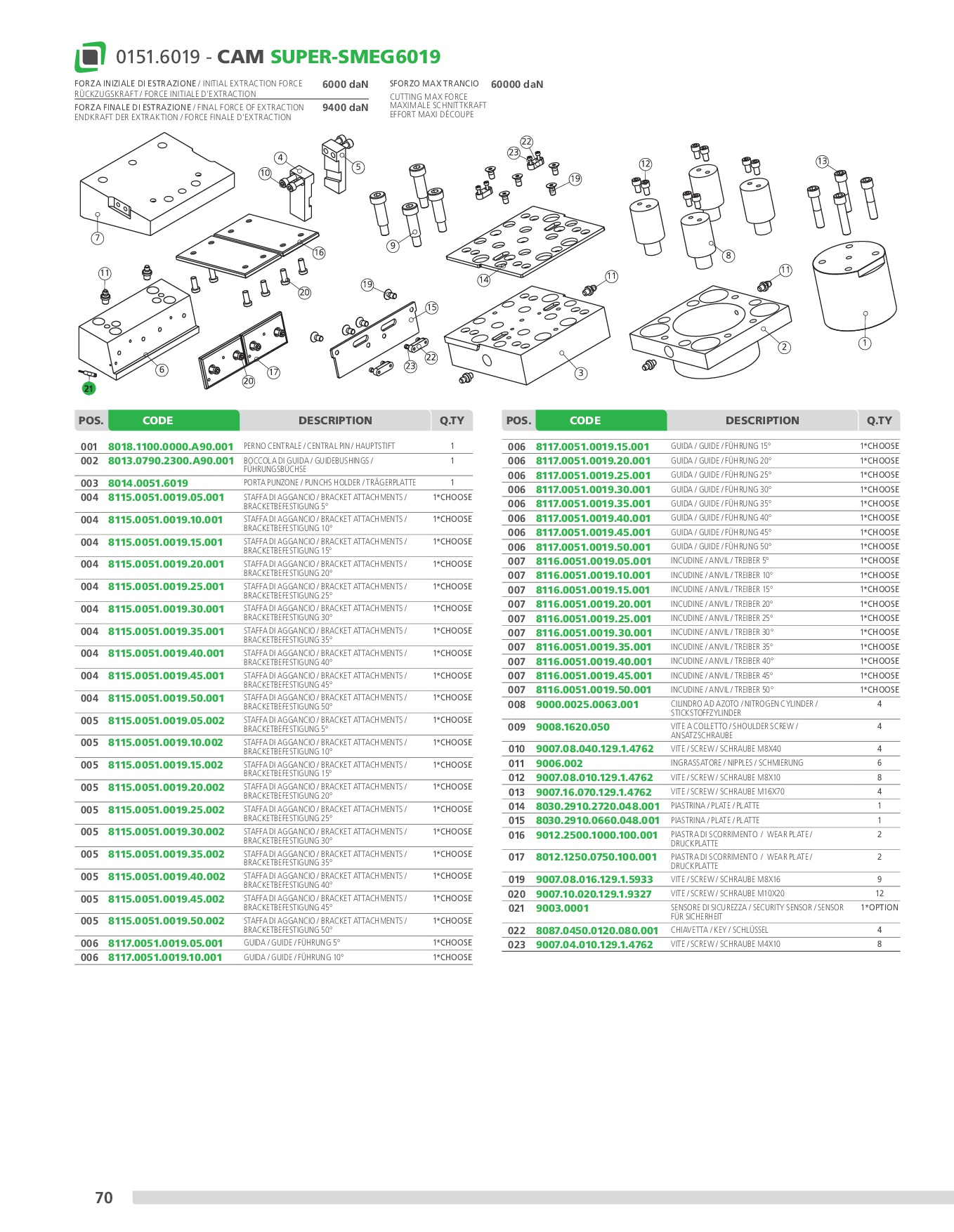 Mechanical cam with a power of up to 60.000 daN with guaranteed re turn through nitrogen cylinders, on which the accessories or steels are applied to perform the desired machining operations. This cam is mounted at an angle of 5° to 50° from the vertical. Means of application: generally suitable for cutting, drilling and bending works.