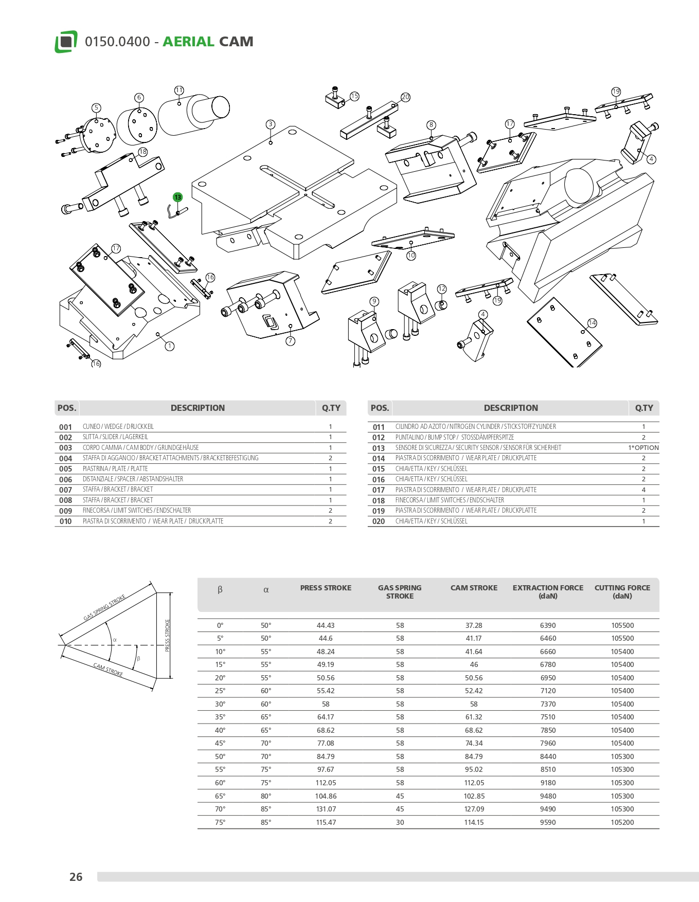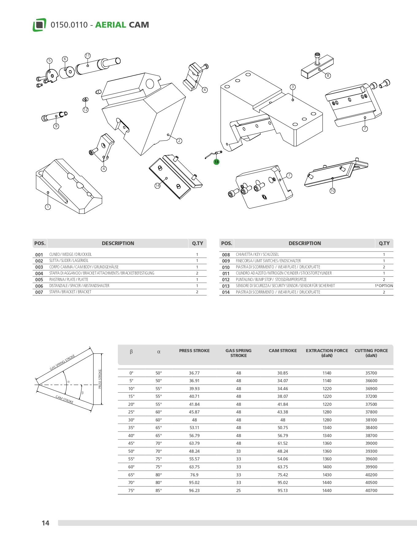 Came mécanique d’une puissance allant jusqu’à 120200 daN avec retour garanti au moyen de vérins à azote, sur lequel sont appliqués les accessoires ou les aciers pour réaliser les usinages souhaités. Cette came peut être montée en position horizontale ou inclinée de 0° à 75°. Applications possibles: convient pour les travaux de découpage, de perçage et de pliage.