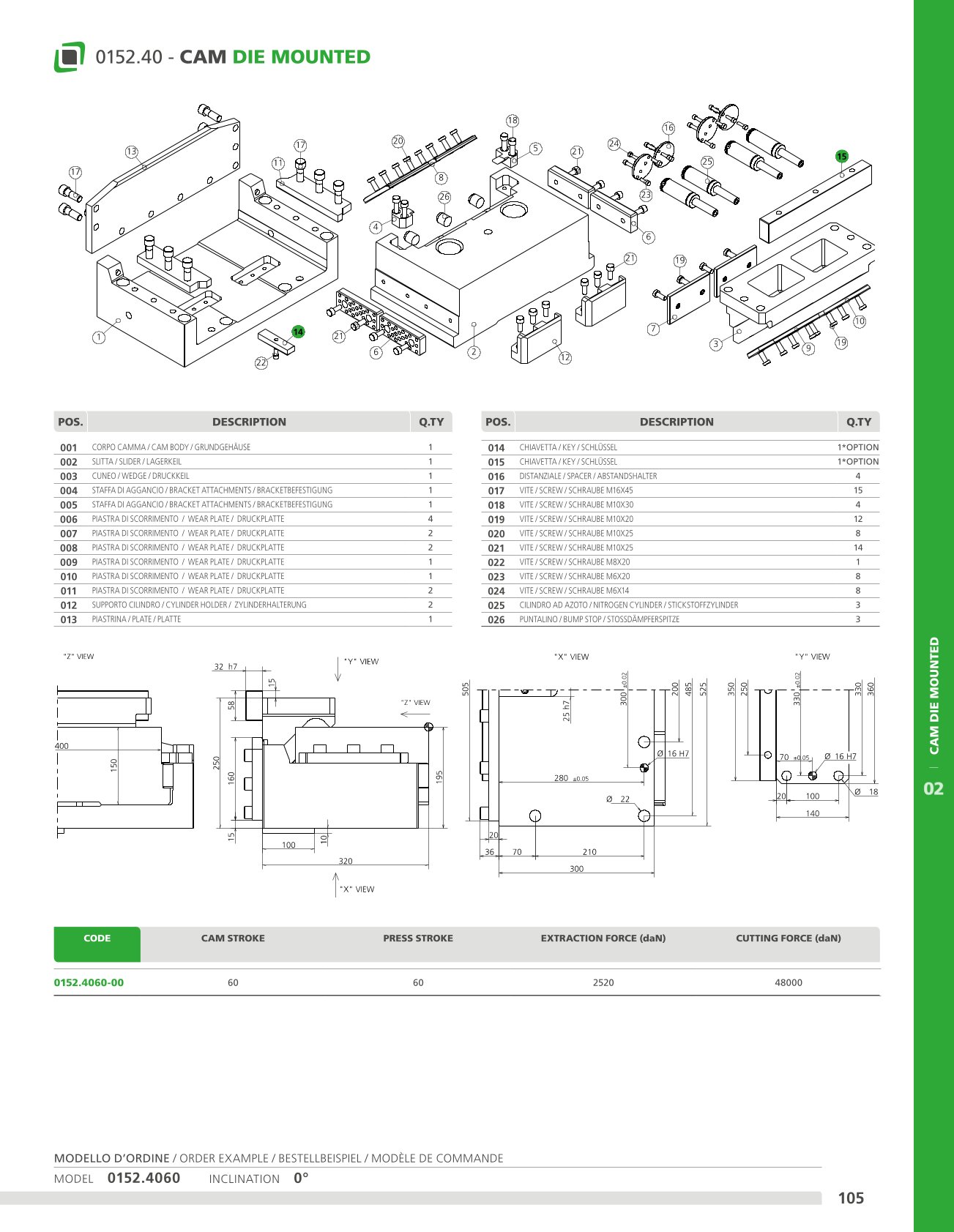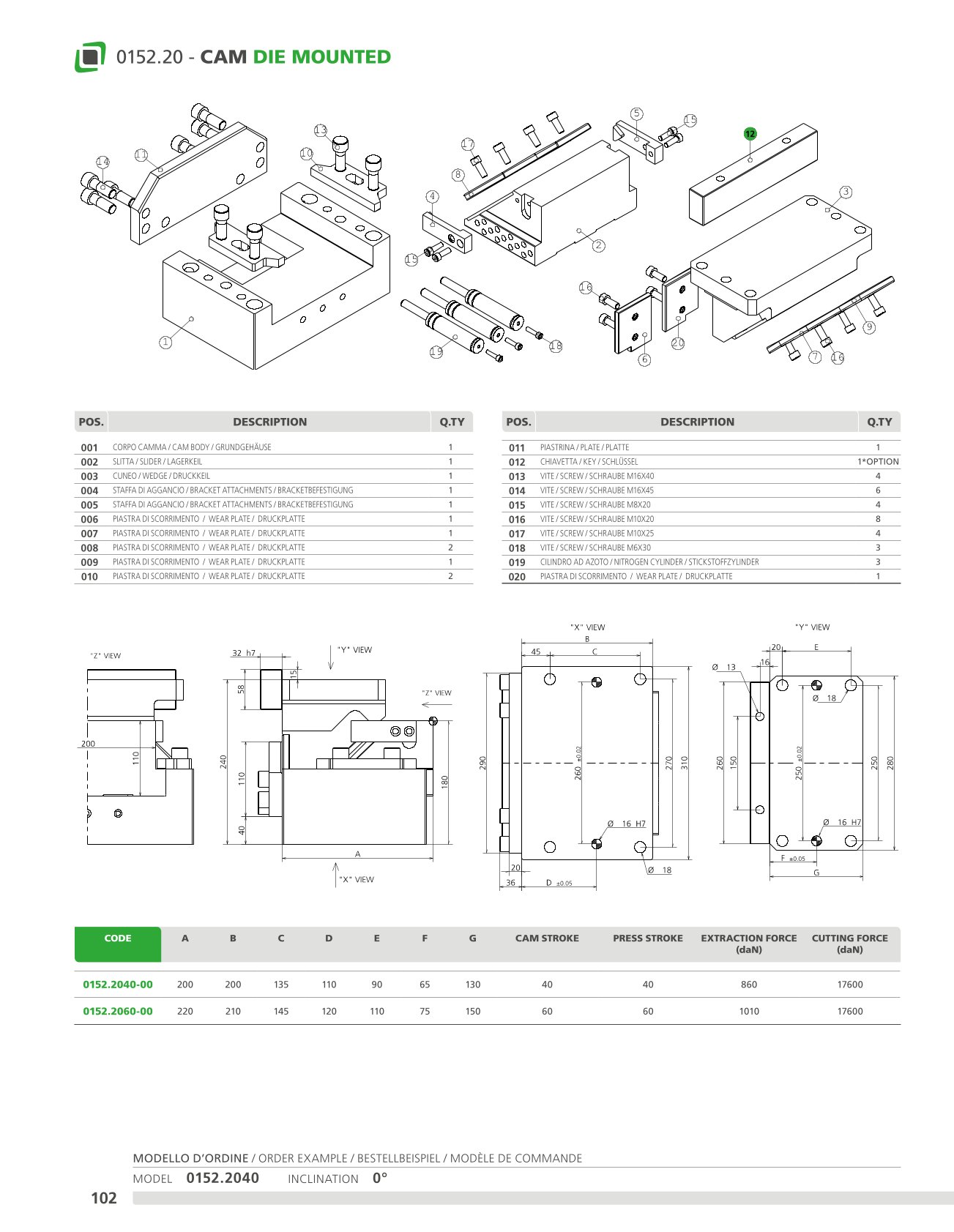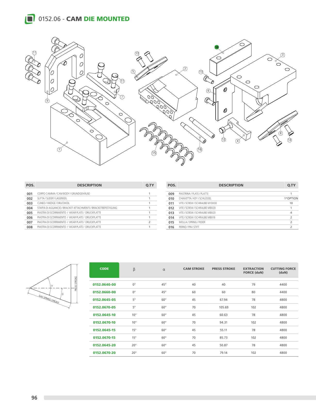 Came mécanique d’une puissance allant jusqu’à 48000 daN avec retour garanti au moyen de vérins à azote, sur lequel sont appliqués les accessoires ou les aciers pour réaliser les usinages souhaités. Cette came peut être montée en position horizontale ou inclinée de 0° à 20°. Applications possibles: convient pour les travaux de découpage, de perçage et de pliage.