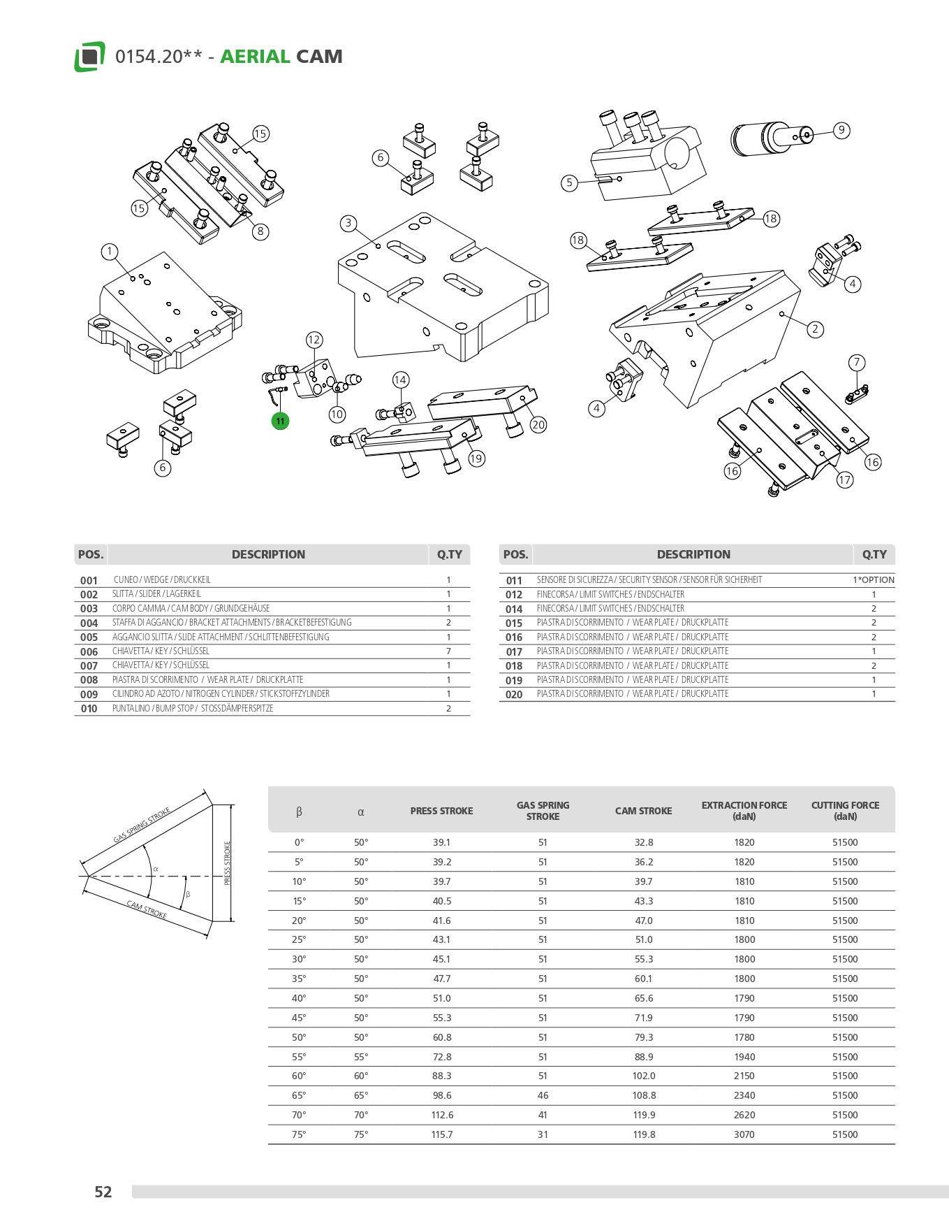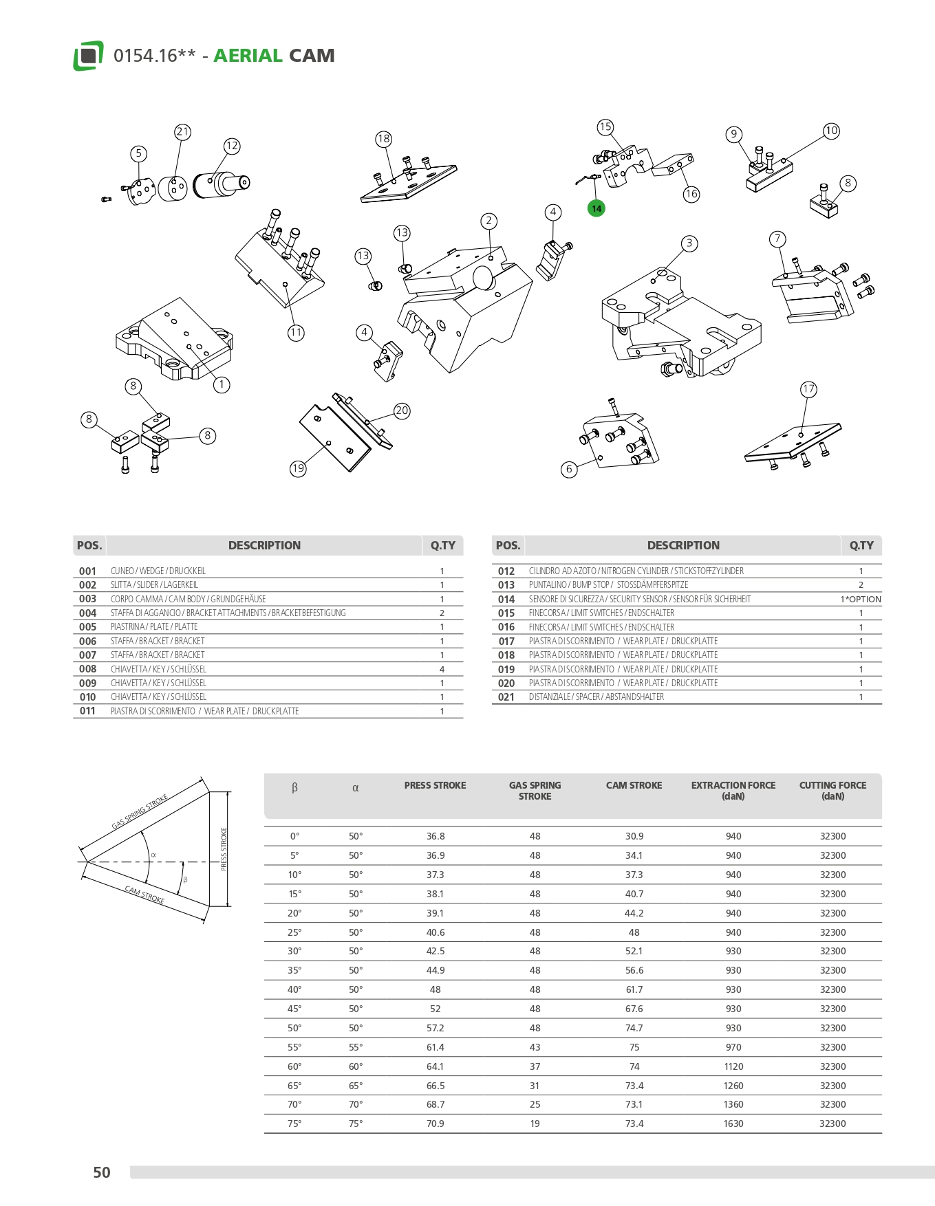 Cam meccanica di potenza fino a 88200 daN con ritorno garantito mediante cilindri ad azoto, su cui vengono applicati gli accessori o gli acciai per eseguire le lavorazioni desiderate. Questa cam può essere montata in posizione orizzontale o inclinata da 0° a 75°.