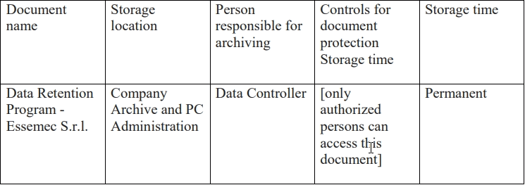 This policy establishes the retention periods required for certain categories of personal data and establishes the minimum standards to be applied when certain information is destroyed within the company Essemec S.r.l. (from now on « The Company »). This policy applies to all business units, processes and data processing systems of the Company. This Policy applies to all employees, collaborators, consultants or suppliers of the Company who may collect, process or access data (including personal data and / or sensitive personal data). It is the responsibility of all the aforementioned subjects to become familiar with this Policy and to ensure adequate compliance with it.