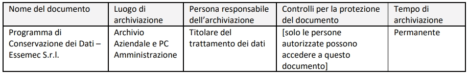 Il Responsabile della Protezione dei Dati definisce il periodo di tempo in cui i documenti e le registrazioni elettroniche devono essere conservate attraverso il programma di conservazione dei dati.